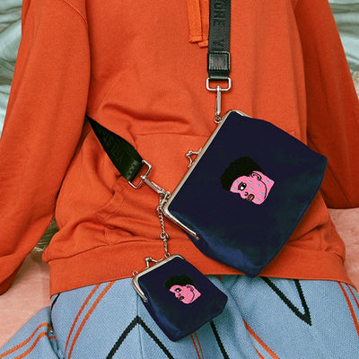 Velvet Clasp bag with embroidery patterns, one regular + one mini, both with a stylish wide shoulder stripe fits with both size bags, use them alone or together, so fun!