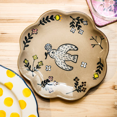 Ceramic plates in vintage clayish style deco, with very special curvy edge. Hand drawn artwork, slightly different from piece to piece.