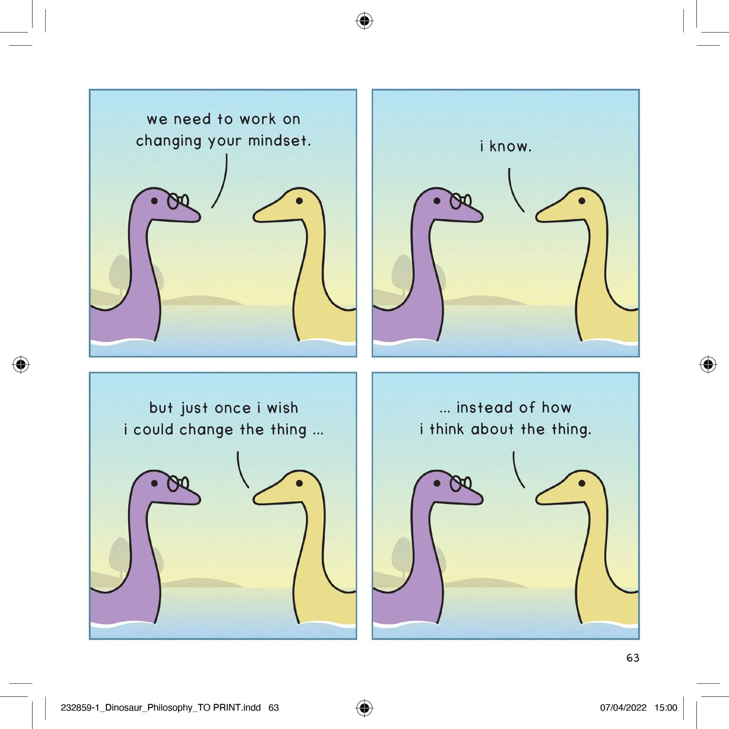 posing questions such as 'do I exist?', 'how should I live?', 'what is beauty?' in each comic, dinosaur characters explore how to exist in the modern world and meditate on what it means to 'live well'.