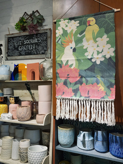 The tropical birds print on hand-woven cotton tapestry is the perfect decoration for your home!