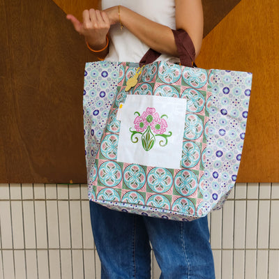 PET large size tote bag with Peranakan tile print, water proof and light weight, durable material with two wide handles, front pocket for small things, with an removable acrylic tag.