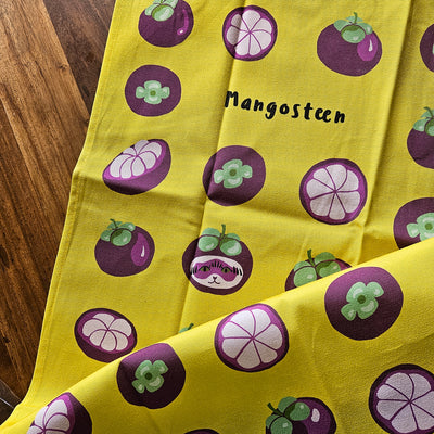 Add color to your Kitchen with this fruity tea towel, mangosteen drawing on beautiful yellow background. Come look for the little kitty hiding inside the mangosteen!